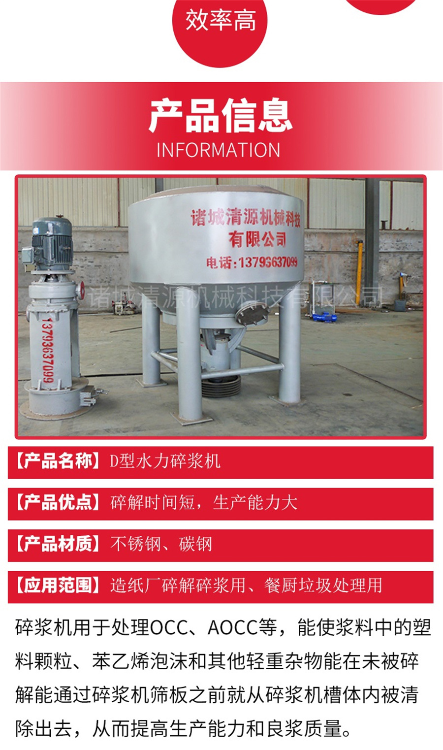 此外,我公司不僅生產(chǎn)D型水力碎漿機,還生產(chǎn)高濃水力碎漿機、地埋式污水處理設備、氣浮機、污泥壓濾機、固液分離設備、造紙設備等其他設備,歡迎咨詢(xún)訂購!