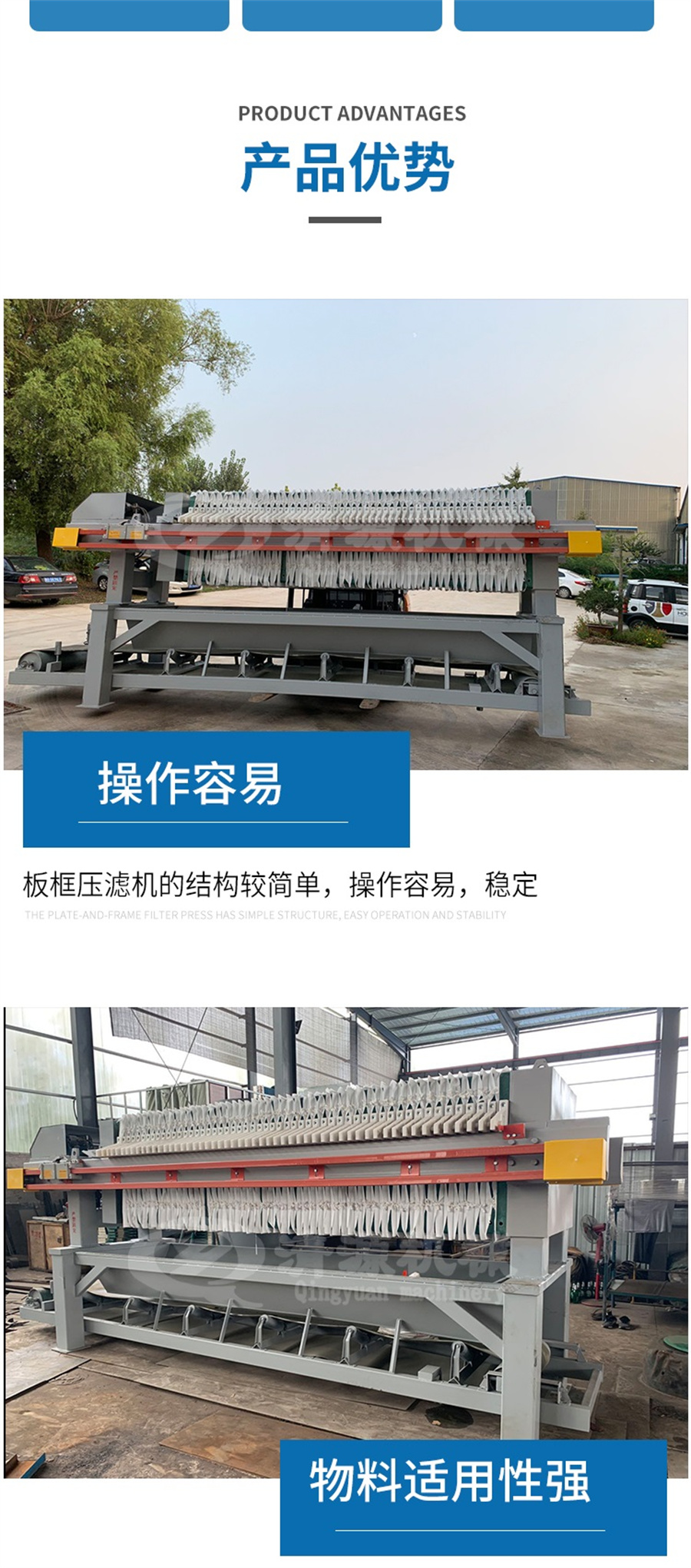 三、優(yōu)點(diǎn):板框式壓濾機的優(yōu)點(diǎn)是:結構較簡(jiǎn)單,操作容易,運行穩定,保養方便;過(guò)濾面積選擇范圍靈活,占地少;對物料適應性強,適用于各種中小型污泥脫水處理的場(chǎng)合。