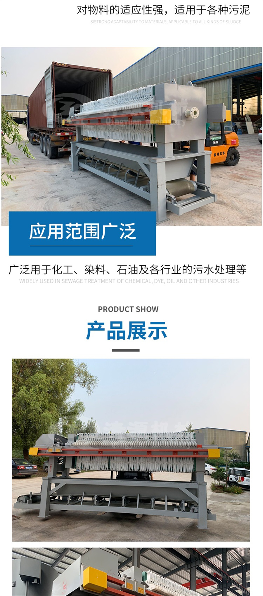 板框式壓濾機對于濾渣壓縮性大或近于不可壓縮的懸浮液都能適用。適合的懸浮液的固體顆粒濃度一般為10%以下,操作壓力一般為0.3~1.6兆帕,特殊的可達3兆帕或更高。過(guò)濾面積可以隨所用的板框數目增減。板框通常為正方形,濾框的內邊長(cháng)為200~2000毫米,框厚為16~80毫米,過(guò)濾面積為1~1200㎡。板與框用手動(dòng)螺旋、電動(dòng)螺旋和液壓等方式壓緊。板和框用木材、鑄鐵、鑄鋼、不銹鋼、聚丙烯和橡膠等材料制造。