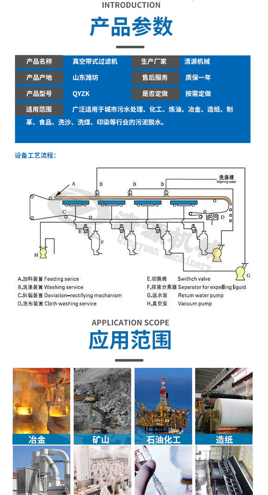 真空帶式過(guò)濾機是一種自動(dòng)化程度高的新型過(guò)濾設備,該機以過(guò)濾布或濾網(wǎng)為介質(zhì),使料漿水平布置于過(guò)濾介質(zhì)之上,充分利用料漿重力和真空吸力實(shí)現固液分離。連續水平帶式真空過(guò)濾機可適用于多種濃度條件下的物料,過(guò)濾效率高,因而被重多工業(yè)界優(yōu)先采用。