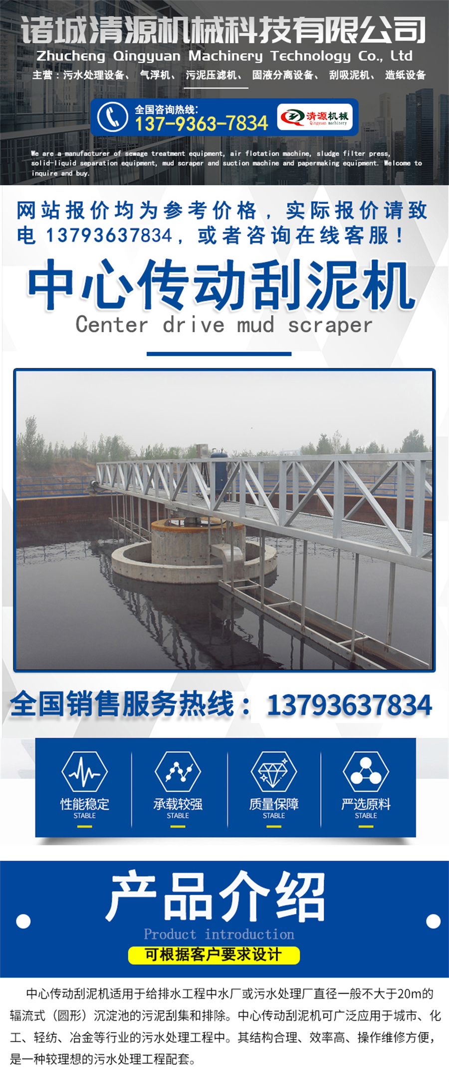 中心傳動(dòng)式刮泥機適用于給排水工程中水廠(chǎng)或污水處理廠(chǎng)直徑一般不大于20m的輻流式(圓形)沉淀池的污泥刮集和排除。中心傳動(dòng)刮泥機可廣泛應用于城市、化工、輕紡、冶金等行業(yè)的污水處理工程中。其結構合理、效率高、操作維修方便,是一種較理想的污水處理工程配套。