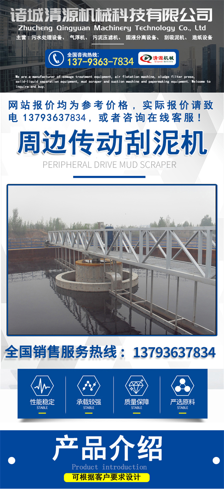 周邊傳動(dòng)刮泥機是城市水廠(chǎng)、城鎮污水處理廠(chǎng)常用的沉淀池刮泥設備。采用中間進(jìn)水、排泥,周邊排水,保證水流均勻。利用液位差自吸式排泥,有浮渣刮集排除裝置和過(guò)載保護裝置,該機適用于大中型輻流式二次沉淀池的排泥與除渣。
