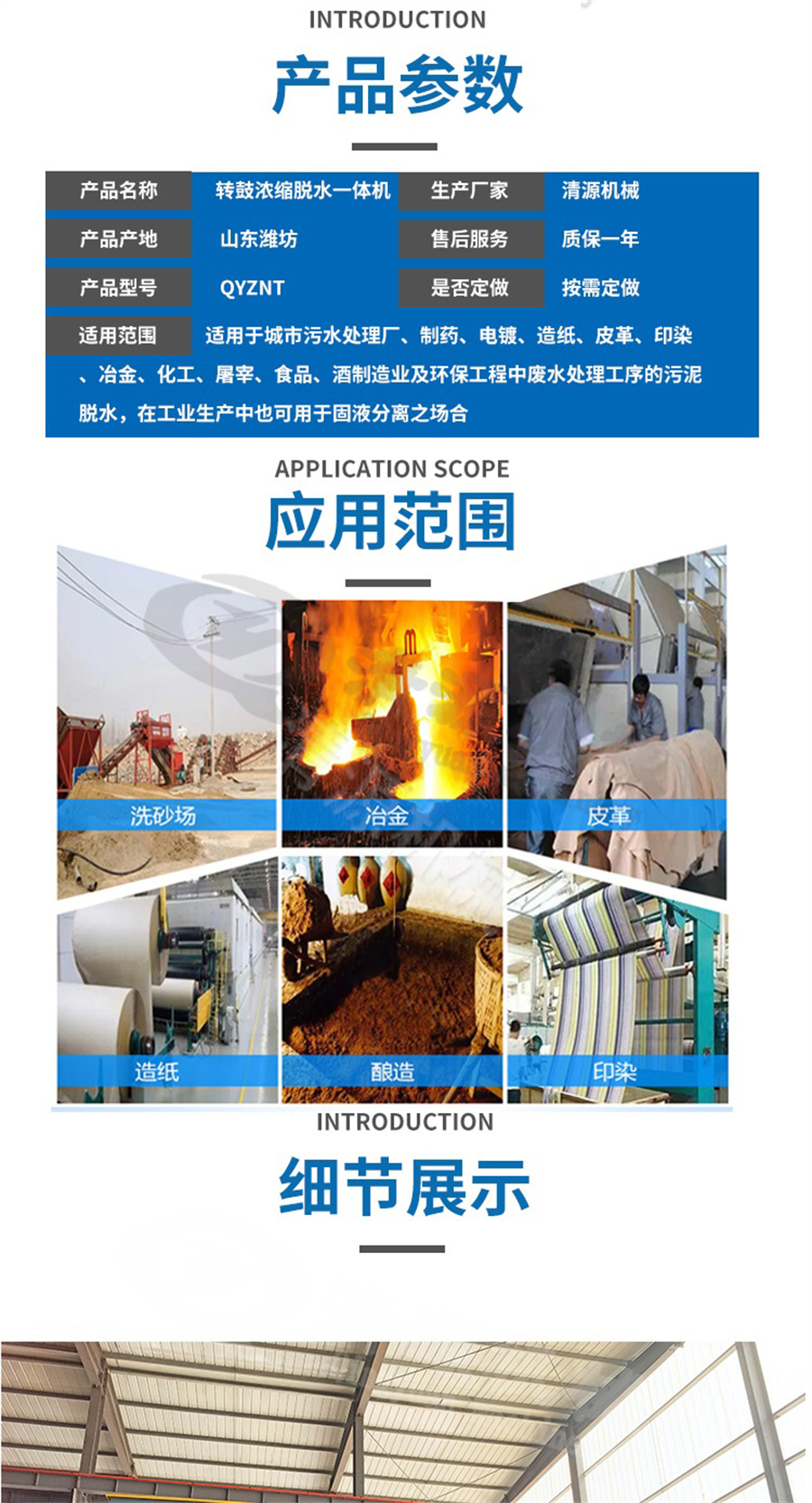 諸城清源機械科技有限公司生產(chǎn)的轉鼓濃縮帶式污泥脫水一體機處理前含固體顆粒含水率:99.4%-98%處理后的含水率:小于80%(可以直接運輸填埋或焚燒)。